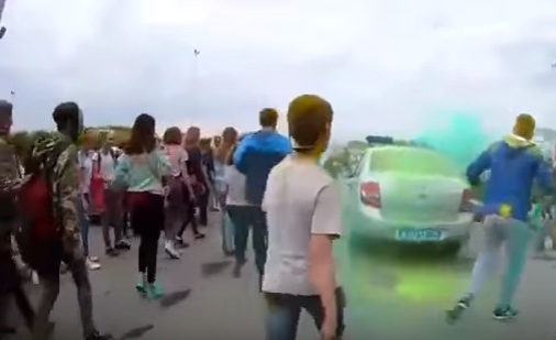 Судя по видеороликам, появившимся в сети, подростки действительно обсыпали краской и пинали автомобили полицейских. Раздавались и нецензурные выкрики. Полицейские, оказавшиеся в центре «красочного действа», выходить из автомобилей не стали. Дубинки не применялись, толпа постепенно разошлась сама.