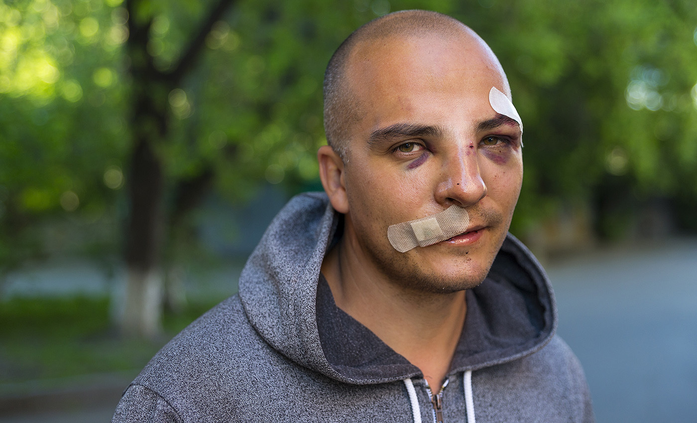 Владилен Бугаев – парень крепкий, занимается спортом, рост – почти два метра. По словам пострадавшего, если бы не занятия спортом, его бы вырубили с одного удара. Били профессионалы. Один из нападавших кулаком пробил дверь. Налицо Владилену пришлось накладывать швы.