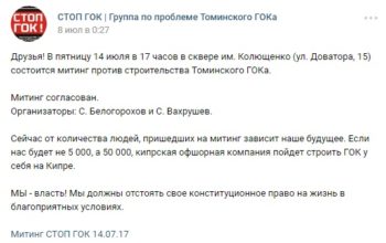 Активисты движения «СТОП ГОК» собираются провести менее пафосное, без министров, но более многолюдное мероприятие – очередной митинг против строительства Томинского ГОКа. Он состоится 14 июля в 17.00. в сквере им. Колющенко.